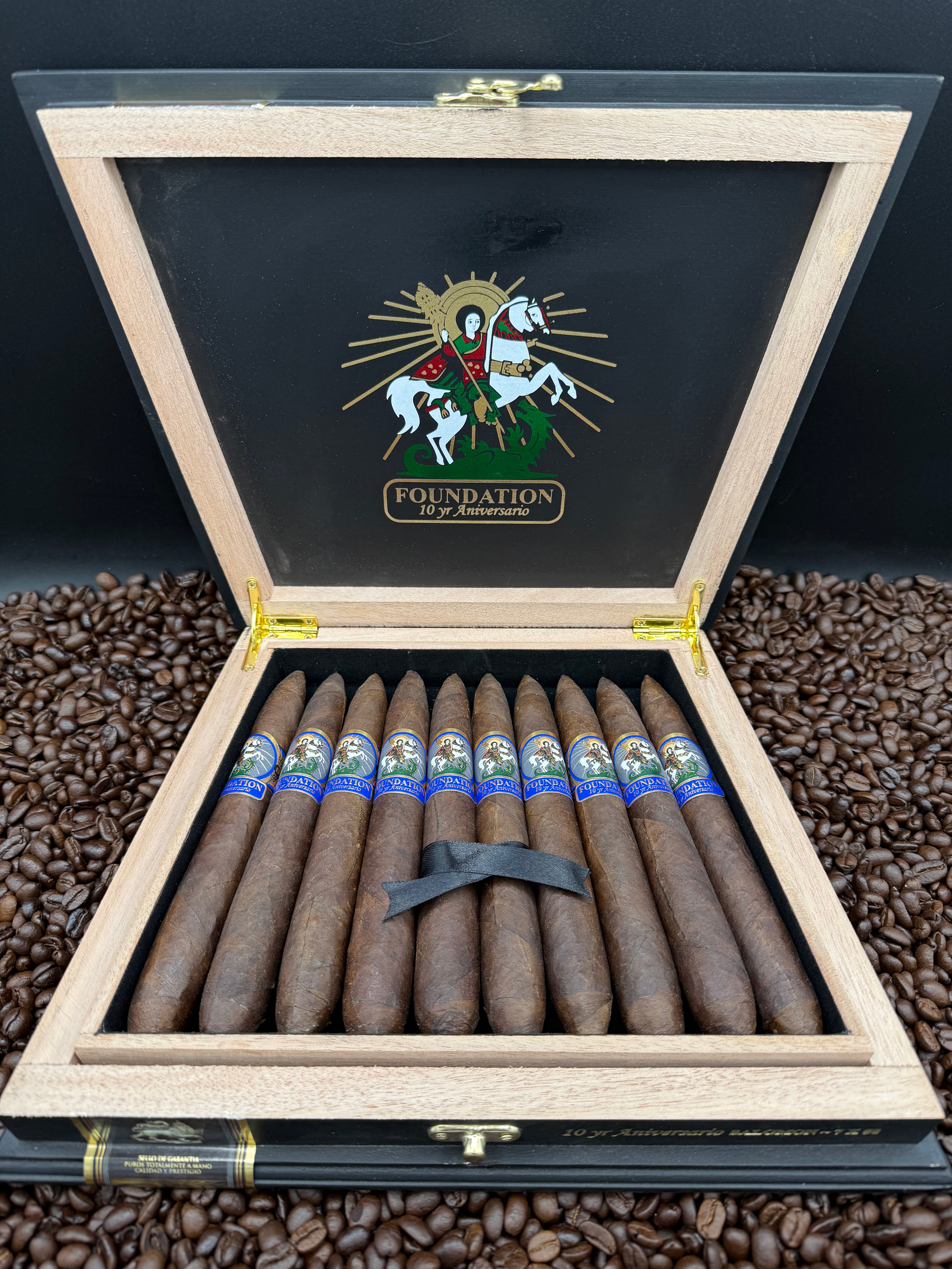 The double-tapered Aniversario cigars measure 7 inches long by 58 ring gauge at their fattest point. Dark and imposing, these figurados are covered in a wrapper from the Connecticut River Valley that company owner Nicholas Melillo says is a hybrid between broadleaf and Habano seeds. Underneath is a Brazilian Mata Fina binder that holds together an entirely Nicaraguan filler blend, a combination of tobaccos from Estelí, Jalapa and Condega. The Nicaraguan components are grown by A.J. Fernandez.