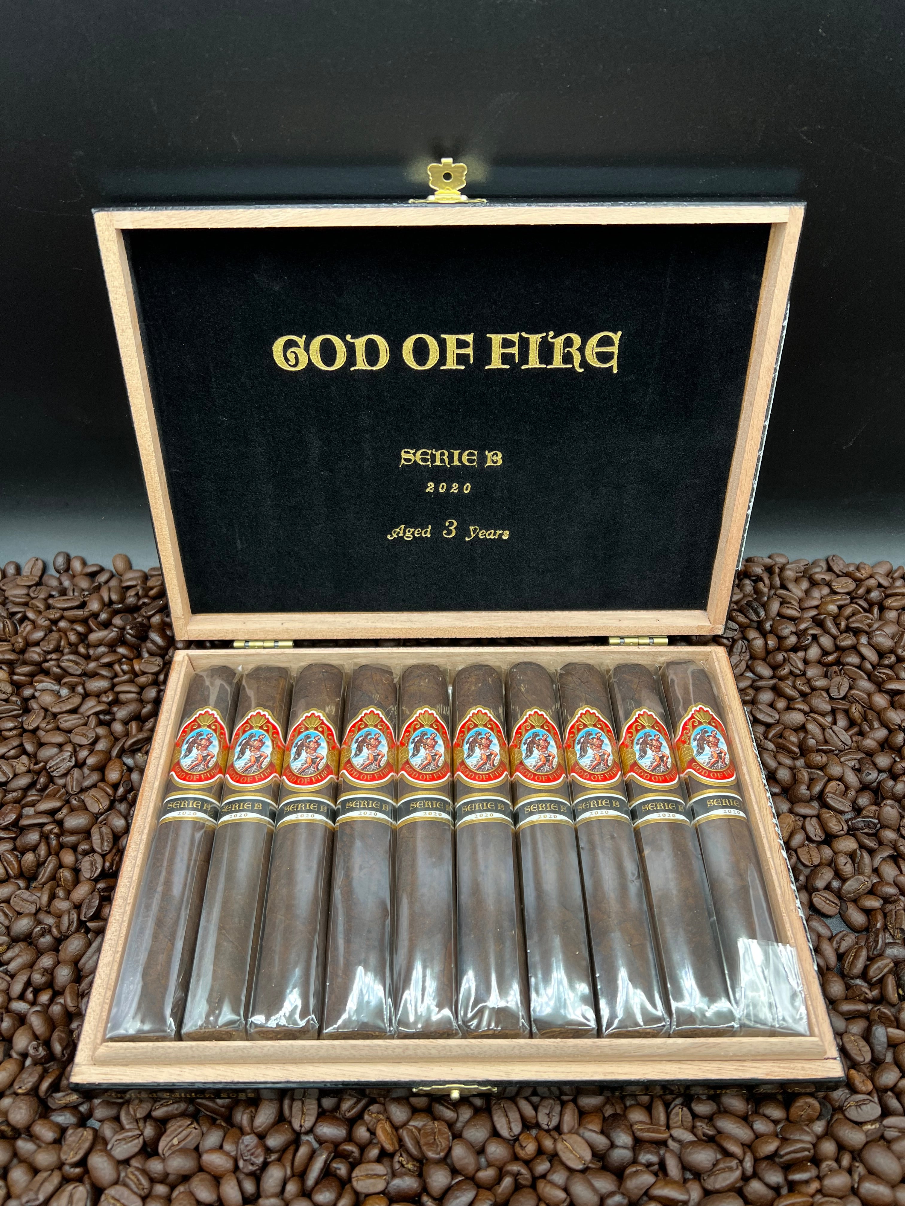 God of Fire Serie B A collection of dark-wrapper cigars that steps up the flavor while remaining light enough for any smoker. The Serie B cigars have a rich, slightly chocolatey taste with hints of pepper. These are cigars that occasional smokers can enjoy and that veteran smokers will want to smoke every day. Wrapper: Connecticut Broad Leaf (Double Robusto and Gran Toro) and Ecuadorian Sungrown (Robusto and Robusto Gordo 54). Filler and Binder: Dominican.